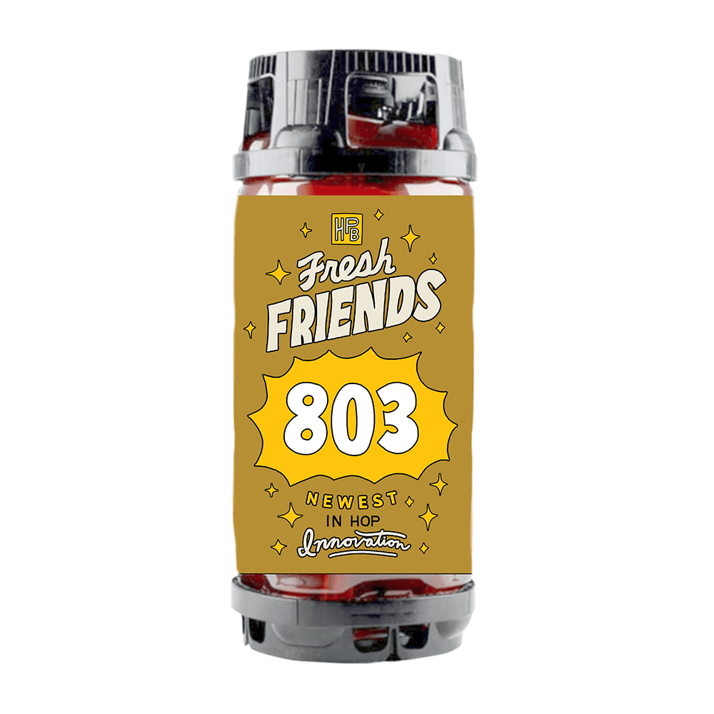 Fresh Friends: 803 is a 7.2% ABV Double Dry Hopped West Coast IPA anchored by YCH 803, a cutting-edge, ultra-concentrated hop oil, this beer also features traditional T90 pellets of Mosaic, Citra, and Simcoe bringing together unprecedented hop intensity with the foundational bitterness and piney resin of a bold, next-generation West Coast IPA.