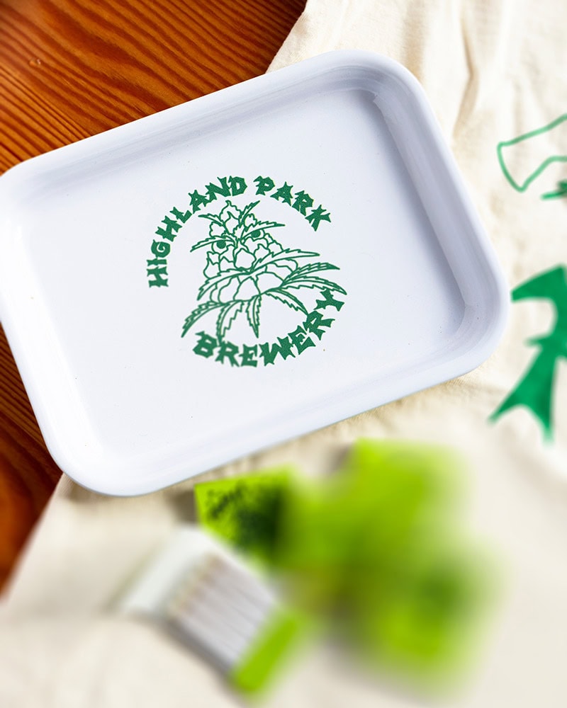 White Highland Park Brewery rolling tray featuring the Turple Monster.